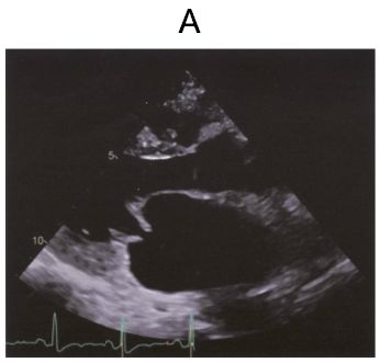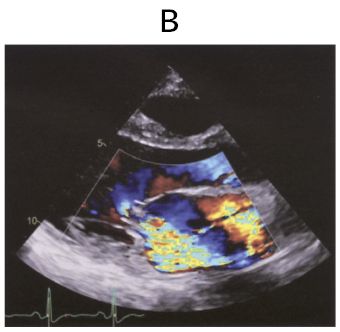 画像B(カラードプラ)では、収縮期僧帽弁逆流・乱流を示すモザイクパターンがみられる