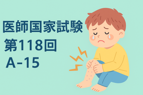 【分野】小児科問題:3歳の男児。発熱と下肢痛を主訴に両親に連れられて来院した。1か月前に左足をひねって疼痛を自覚した。その後右下肢の疼痛も訴えるようになった。2週間前に38℃台の発熱が出現し、両下肢の疼痛も増強した。かかりつけ医を受診...